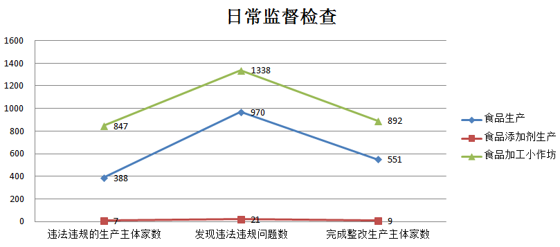 (二)食品日常监管情况1、食品生产环节日常监管情况 2018年二季度,全省日常监管工作中,共检查食品生产企业5891家、食品添加剂生产企业79家、食品加工小作坊11190家。出动检查人员41845人次,其中食品生产企业16756人次,食品添加剂生产企业437人次,食品加工小作坊24652人次。快检生产主体数1140家次,其中食品生产企业538家次,食品添加剂生产企业1家次,快检食品加工小作坊601家次;快检食品批次数2800批次,其中食品生产企业1707批次,食品添加剂生产企业1批次,快检食品加工小作坊1092批次;快检不合格食品批次数79批次,其中食品生产企业33批次,快检食品加工小作坊46批次。详见附表2。 日常监督检查中发现违法违规的生产主体数1242家次,其中食品生产企业388家次,食品添加剂生产企业7家次,食品加工小作坊847家次;发现违法违规问题数2329个,其中食品生产企业970个,食品添加剂生产企业21个,食品加工小作坊1338个;完成整改生产主体数1452家次,其中食品生产企业551家次,食品添加剂生产企业9家次,食品加工小作坊892家次。