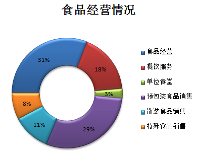 食品流通许可证数量(旧)150666件,餐饮服务许可证数量(旧)92508件,有效许可证数量总和620775件。 按食品种类划分,热食类食品制品148158家,冷食类食品制品16137家,生食类食品制品2495家,糕点类食品制品6880家,自制饮品销售14576家。