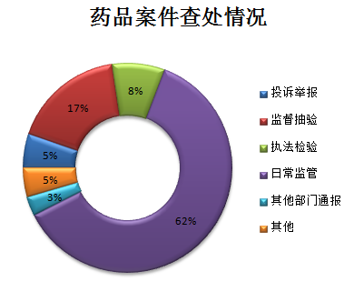 图3-1-2全省药品经营企业日常监管情况 二、药品案件查处情况2018年二季度,各级监管机构共查处违法药品案件总数1007件,其中一般程序案件798件,简易程序案件209件,货值金额411.31万元,罚款金额776.9万元,没收违法所得金额78.36万元;取缔无证经营1户,捣毁制假售假窝点2个,责令停产停业3户,吊销经营许可证4件,移送司法机关案件数39件,行政处罚案件信息公开数409件,符合公开条件的行政处罚案件419件。 从案件来源看,投诉举报53件,监督抽验175件,执法检验82件,日常监管和专项检查622件,其他部门通报30件,其他45件。 从货值来看,5万元以下的案件998件,5万元以上的案件9件。